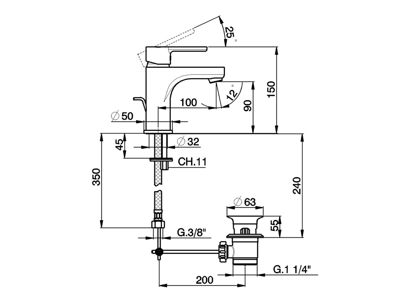 Miscelatore monocomando lavabo large,con scarico automatico 1"1/4,flex inox G.3/8"