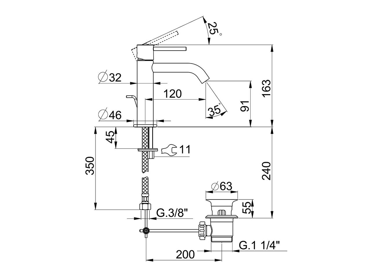 Miscelatore monocomando lavabo large,con scarico automatico 1"1/4,flex inox G.3/8"