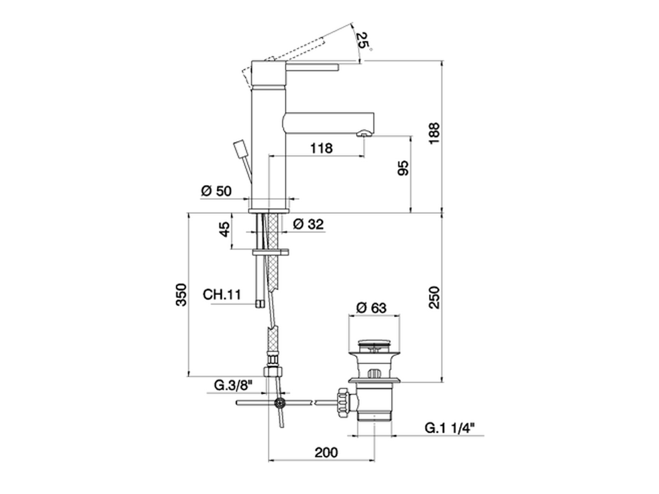 Miscelatore monocomando lavabo large,con scarico automatico 1"1/4,flex inox G.3/8"