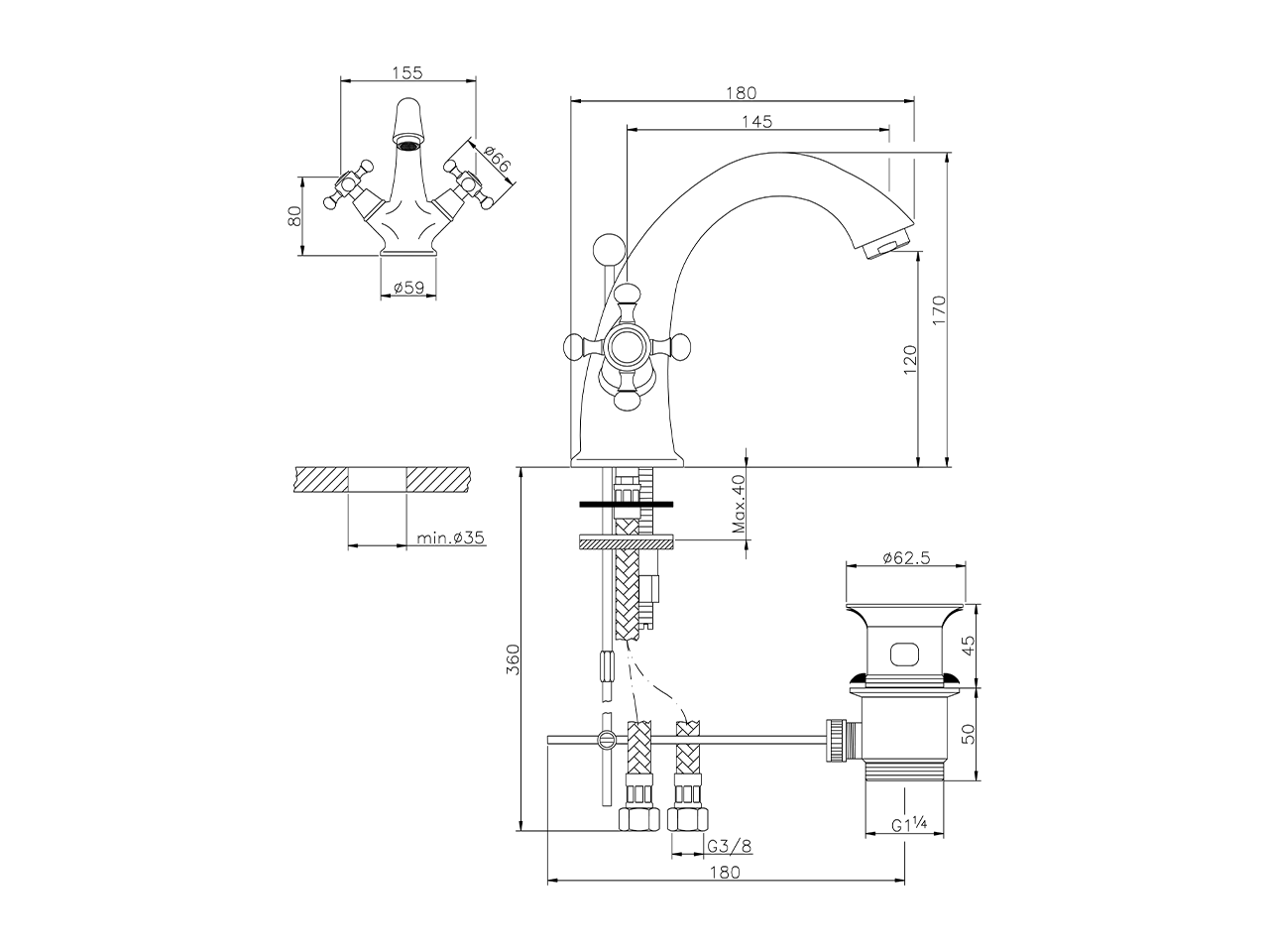 Miscelatore lavabo,con scarico automatico 1"1/4,flex inox G.3/8"