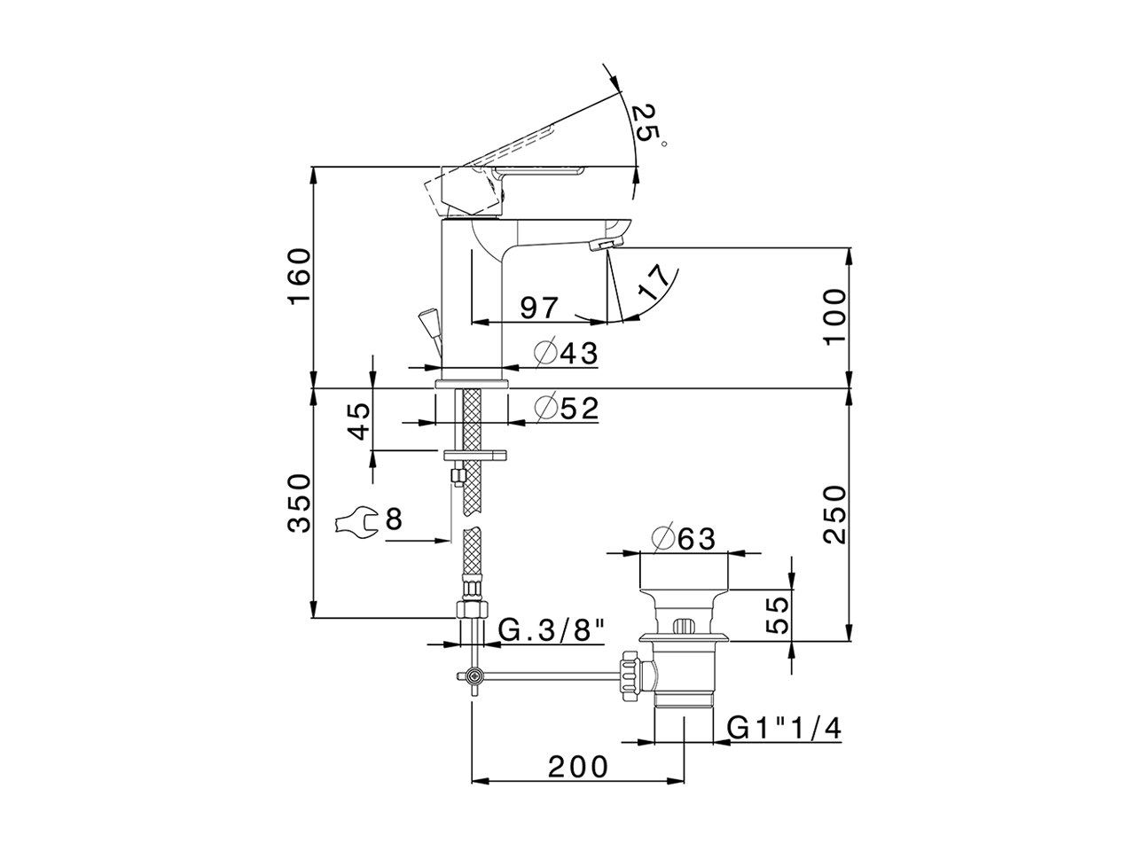 Miscelatore monocomando lavabo,con scarico automatico 1"1/4,flex inox G.3/8"