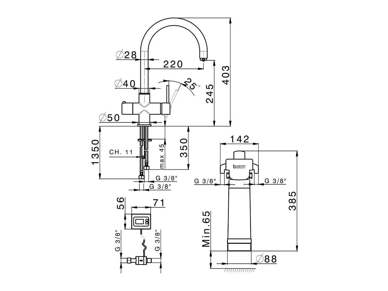 Miscelatore monocomando lavello PURE,bocca girevole,erogazione separata: acqua filtrata,acqua di rete,comando apertura acqua depurata,set filtrazione BWT composto da:,- contalitri per monitoraggio filtro,- testa filtro BWT,- filtro BWT "BestTaste" (10.000 litri),carbone attivo elimina odori e sapori indesiderati,filtrazione particelle,riduzione metalli pesanti