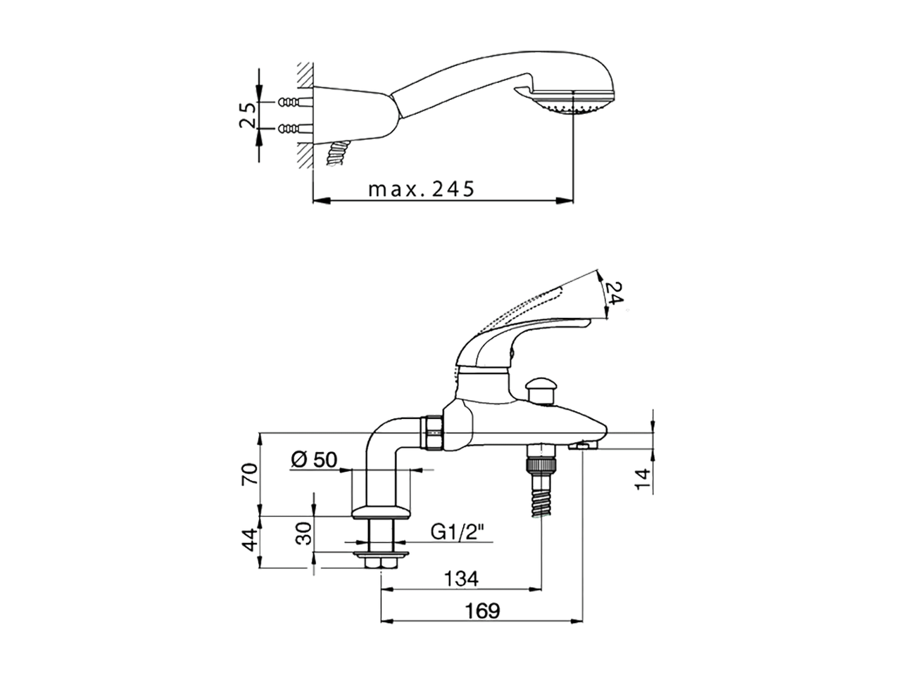 Miscelatore monocomando vasca completo,supporto doccetta snodato murale,doccetta Teti 3 getti in ABS,flex Ottone 150 cm