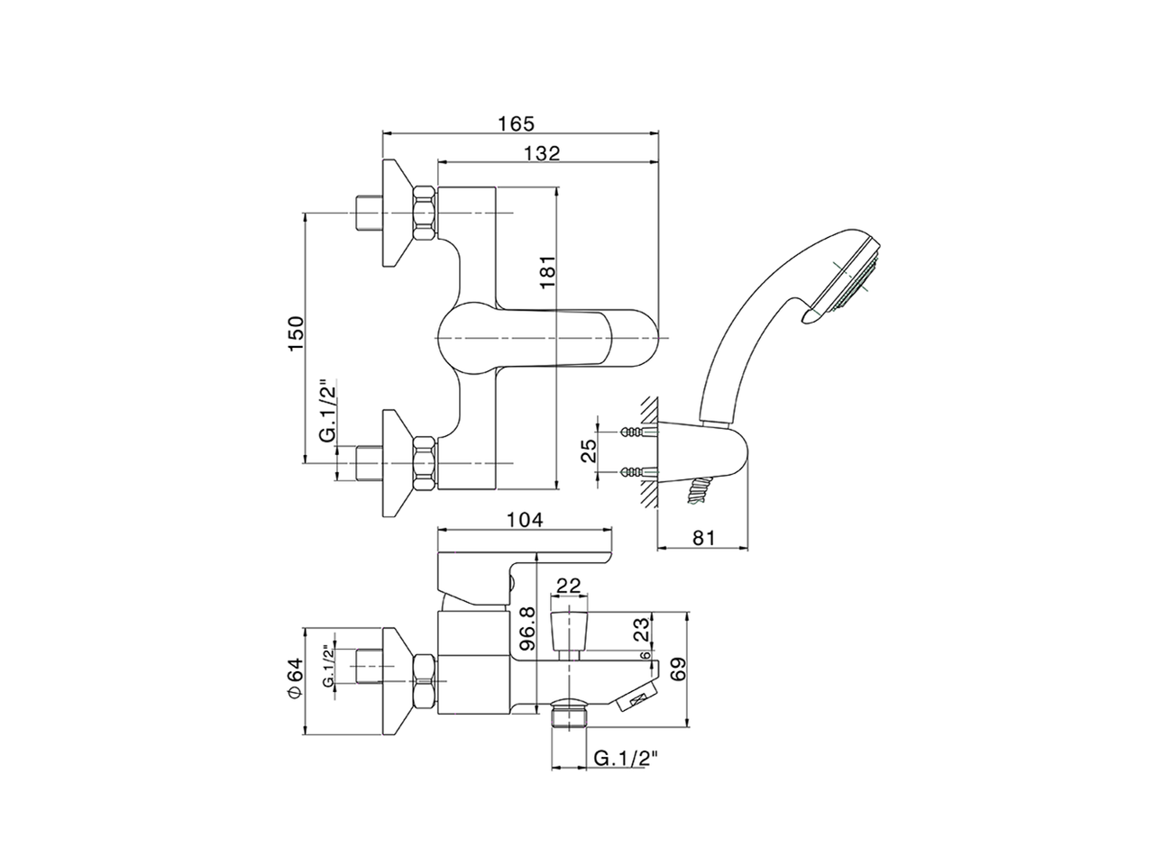 Miscelatore monocomando vasca completo,supporto doccetta snodato murale,doccetta Teti 3 getti in ABS,flex inox 150 cm