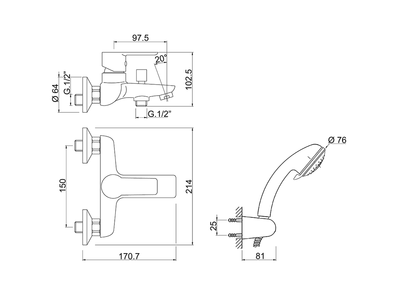 Miscelatore monocomando vasca completo,supporto doccetta snodato murale,doccetta Teti 3 getti in ABS,flex Ottone 150 cm