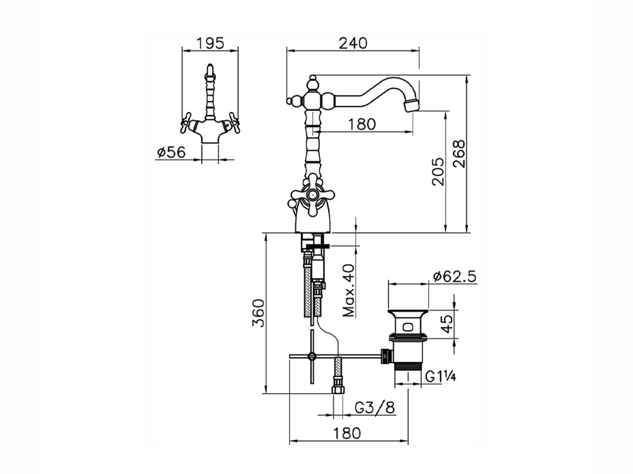 Miscelatore termostatico lavabo,con scarico automatico 1"1/4,bocca girevole,flex inox G.3/8"