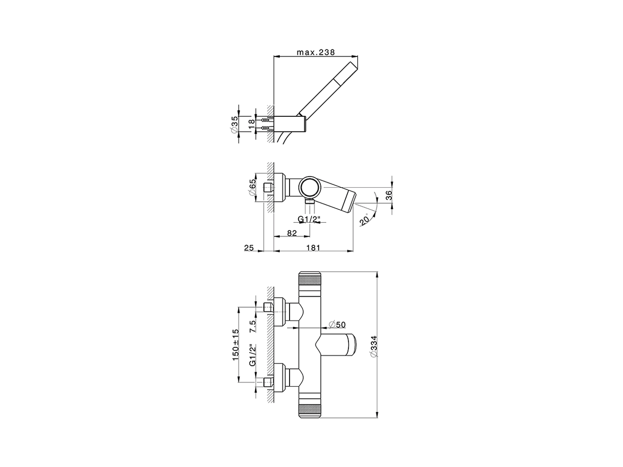 Miscelatore termostatico vasca completo,supporto doccetta snodato murale,doccetta monogetto minimale D.24mm in Ottone,flessibile liscio SUPREME 150 cm