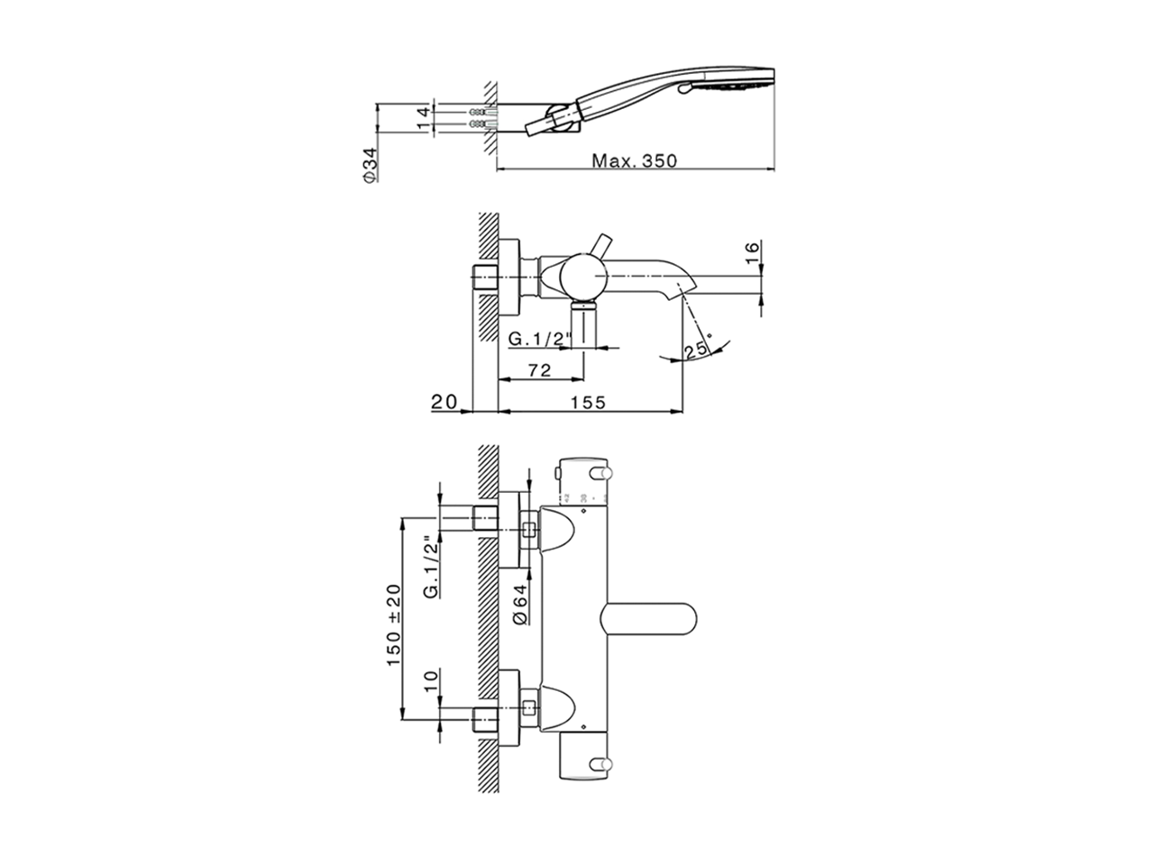 Miscelatore termostatico vasca completo,supporto doccetta snodato murale,doccetta 3 getti D.100 mm ABS,flessibile liscio SUPREME 150 cm