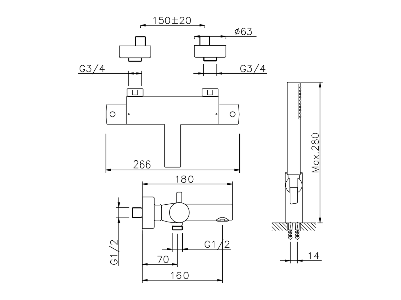 Miscelatore termostatico vasca completo,supporto doccetta snodato murale,doccetta monogetto minimalista in ABS D.
