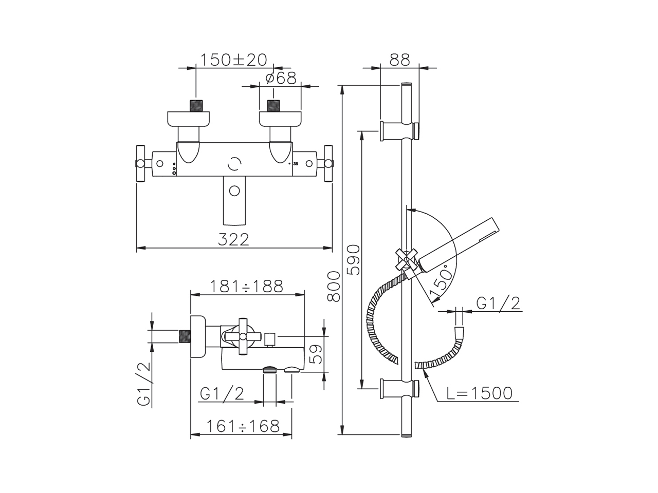 Miscelatore termostatico vasca con saliscendi,saliscendi con supporto scorrevole 59 cm,doccetta monogetto minimalista D.27 mm ABS,flex Ottone 150 cm