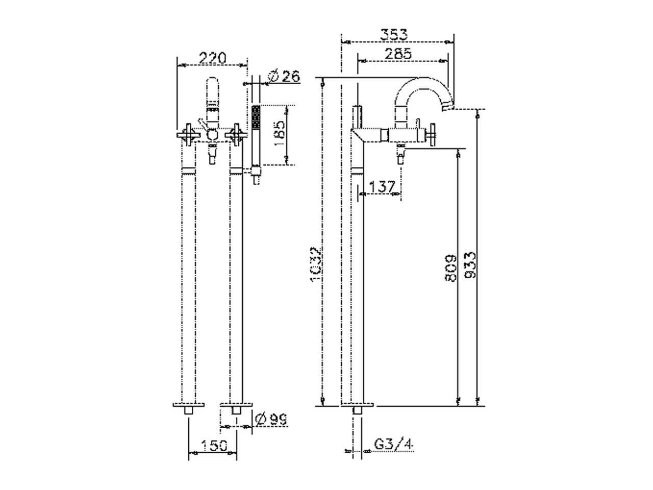 Miscelatore vasca colonne pavimento,supporto doccetta su colonna,doccetta monogetto minimalista D.27 mm ABS,flex Ottone 150 cm
