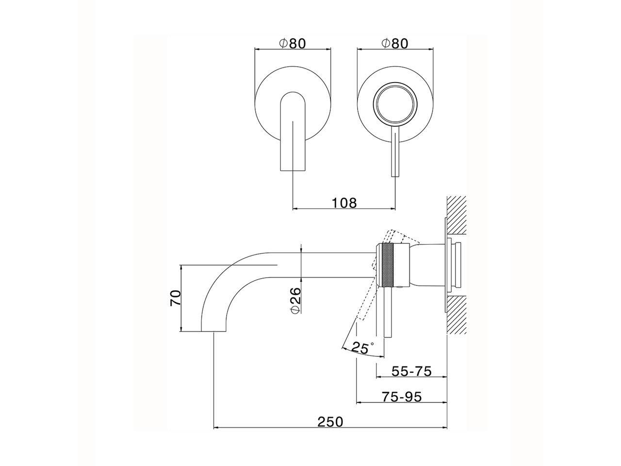 Parte esterna monocomando lavabo a parete,senza parte incasso,bocca L.250 mm,per art.