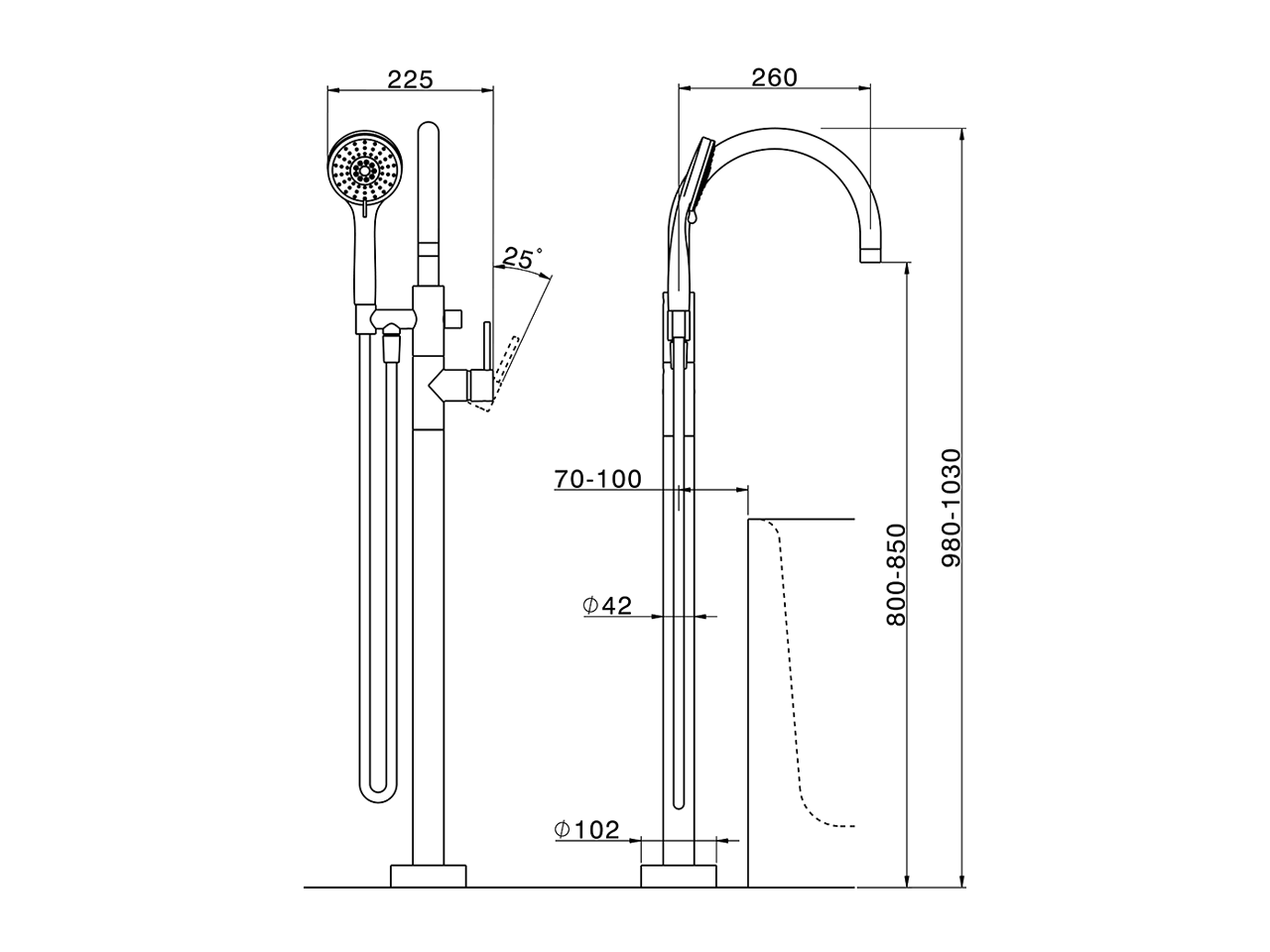 Parte esterna monocomando vasca a pavimento,supporto doccetta su colonna,doccetta 3 getti ABS su supporto su colonna,flessibile liscio SUPREME 150 cm,senza parte incasso (per art.