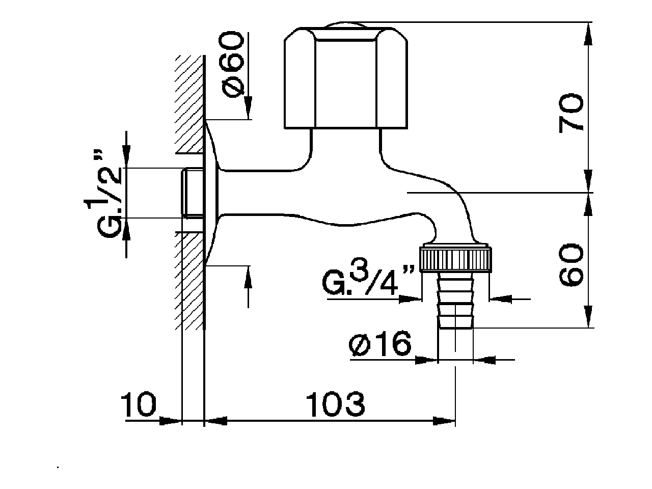 Rubinetto monoacqua a parete,con portagomma,senza maniglia